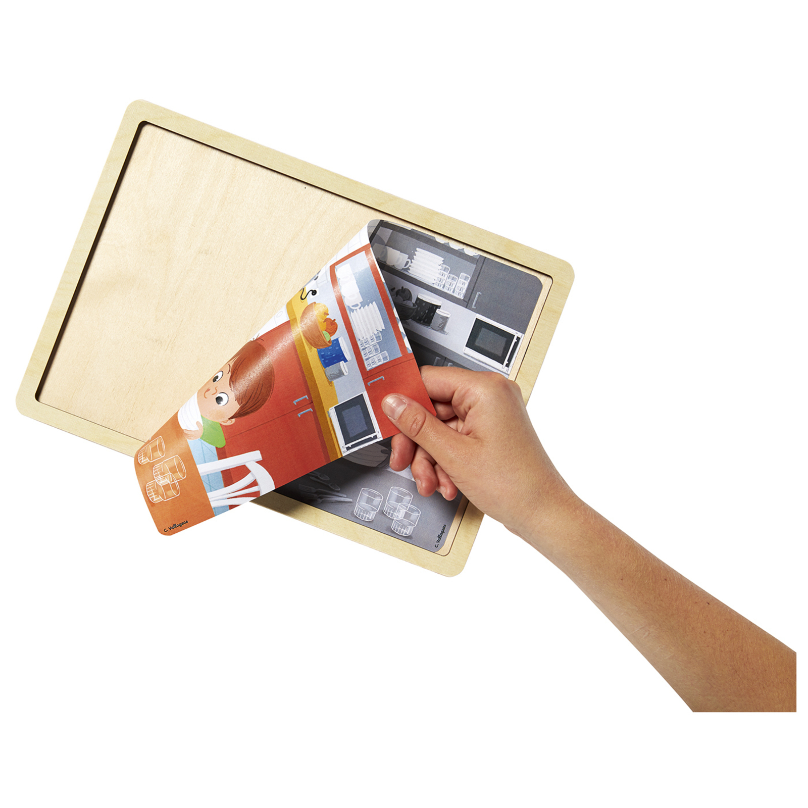 Un puzzle en bois sur le thème de la maison.• Ce puzzle sur le thème de la maison peut être reconstitué avec ou sans le modèle (amovible).