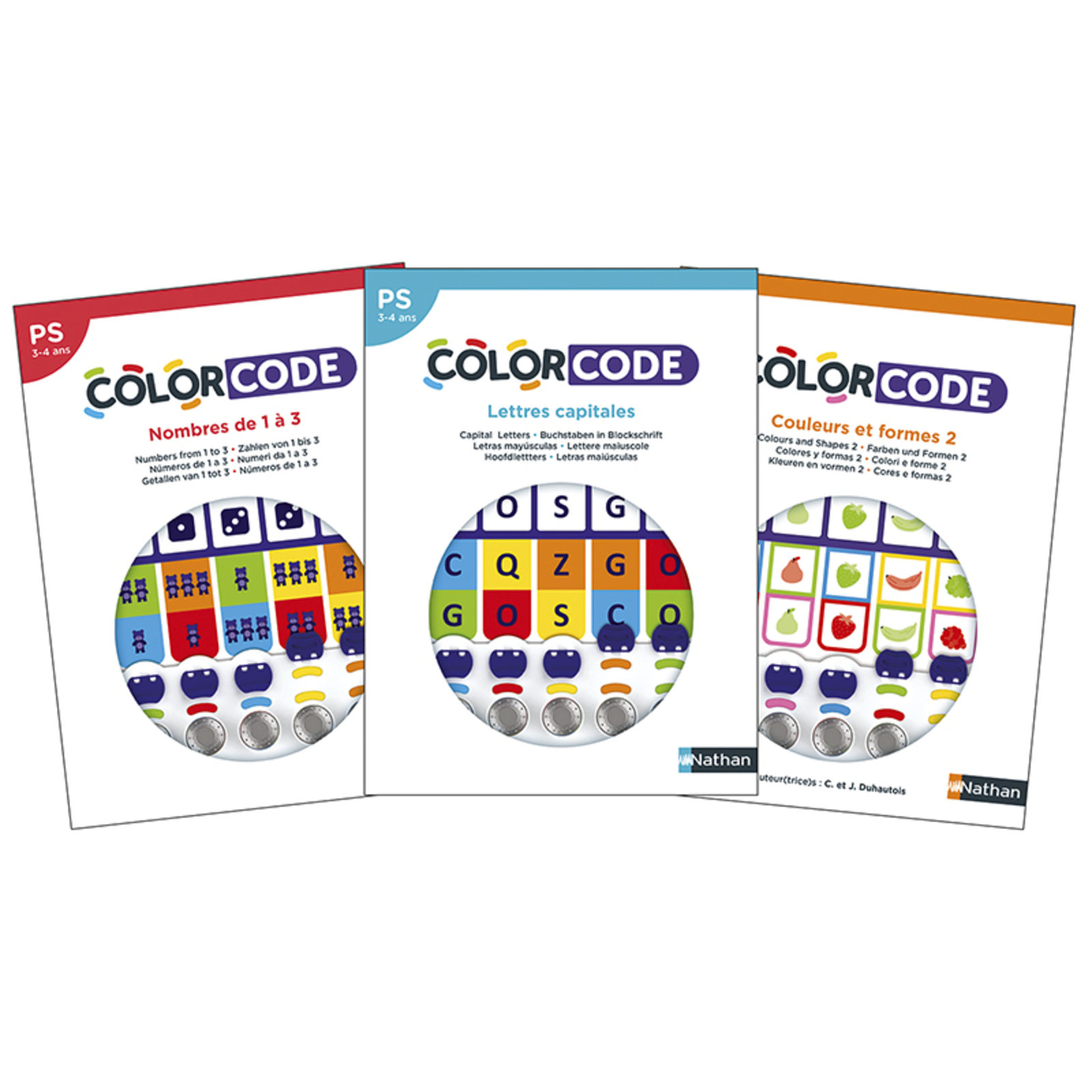 COLORCODE - Nombres de 1 à 3 propose des activités pour identifier, dénombrer, associer des quantités de 1 à 3. L'enfant se familiarise avec différentes représentations du nombre : collections, doigts de la main, constellations du dé et écriture chiffrée.COLORCODE - Lettres capitales propose des activités pour reconnaître et jouer avec les 26 lettres de l’alphabet en capitale d’imprimerie.COLORCODE - Couleurs et formes 2 propose des activités pour associer des éléments (végétaux, objets, animaux, etc.) selon une puis deux propriétés : couleur et forme.À utiliser avec les supports COLORCODE vendus séparément.COLORCODE est un nouveau principe de jeu autocorrectif pour travailler à son rythme et un support élève au design unique pour créer un effet de surprise !- Les activités fonctionnent toutes avec un code couleur pour la réponse de l’élève et la solution, ce qui rend COLORCODE très simple d’utilisation et accessible aux plus petits.- À chaque nouvelle activité, il faut trouver la combinaison de couleurs gagnante, comme pour l’ouverture d’un coffre-fort…Comment utiliser COLORCODE ? Pour jouer, rien de plus facile !Étape 1 : Insérer une fiche d’activité dans le support. Fermer les volets et tourner les boutons pour faire apparaître la couleur blanche.Étape 2 : Décoder la consigne puis répondre colonne par colonne en faisant tourner le bouton pour sélectionner la réponse.Étape 3 : Soulever les volets et vérifier la correspondance des couleurs. Si les 2 couleurs sont identiques, le code est bon… C’est gagné ! Chaque pochette contient : 12 fiches cartonnées (L/l : 19,8 x 26,5 cm).1 livret pédagogique.