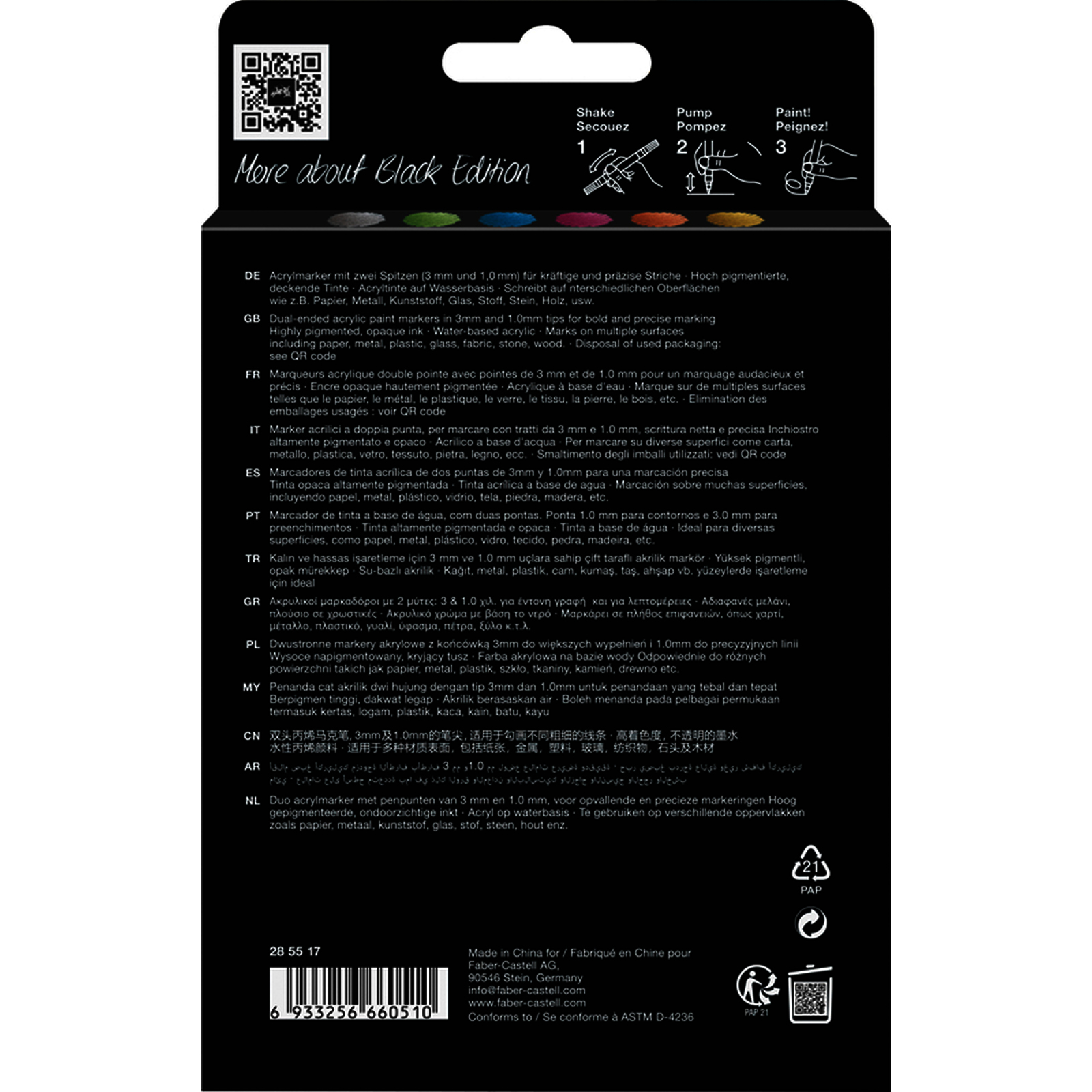 Les marqueurs acryliques Faber-Castell Black Edition sont des outils polyvalents avec une double pointe (1 mm et 3 mm) pour des d?tails fins et des aplats. Ils offrent une opacit? et une intensit? exceptionnelles sur divers supports comme le papier, le m?tal, le plastique et plus encore.
