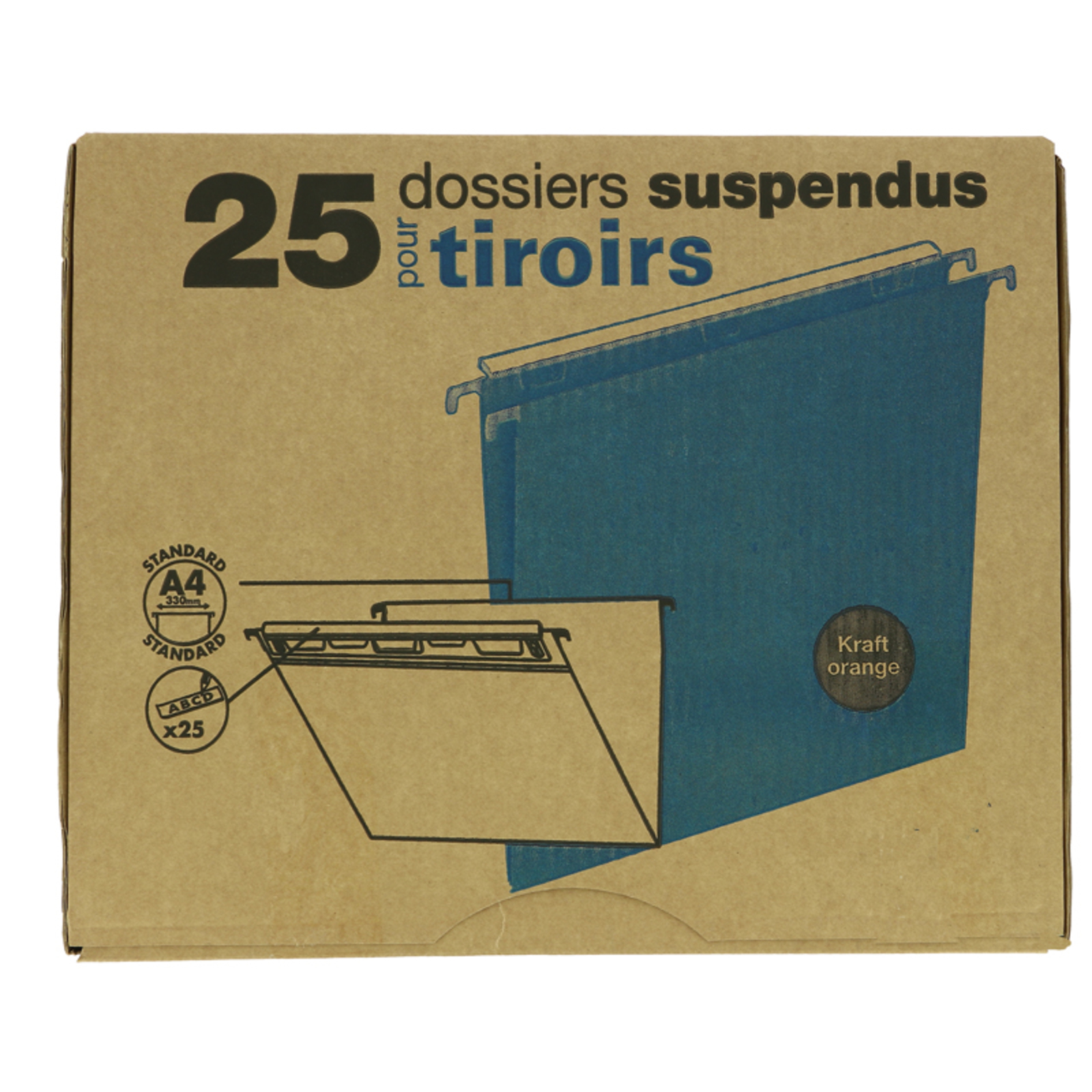 Kraft recyclé, barrettes de suspension en métal. Porte étiquette effet loupe. Entraxe de 33 cm. Mise en continu par volet d’agrafage. Hauteur des dossiers suspendus : Pour armoires : 27,5 cm. Pour tiroirs : 24,5 cm.La boîte de 25 dossiersRecyclé