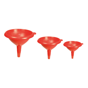 Ensemble de 3 entonnoirs, tailles assorties, coloris rouge. (grand : 12 x 12 cm, moyen : 10 x 10 cm, petit : 8 x 8 cm). Matière : plastique.Le lot de 3 pièces