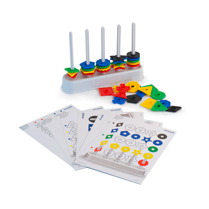 Trier, classer et compter grâce à l’abaque et ses formes colorées. En suivant les fiches ou en activité libre, les enfants exercent leurs capacités d’observation et de logique. Matière : plastique souple et incassable.Contenu : 1 abaque de 5 tiges, 50 pièces (10 formes 5 couleurs assorties) et de 12 fiches d’activités recto verso