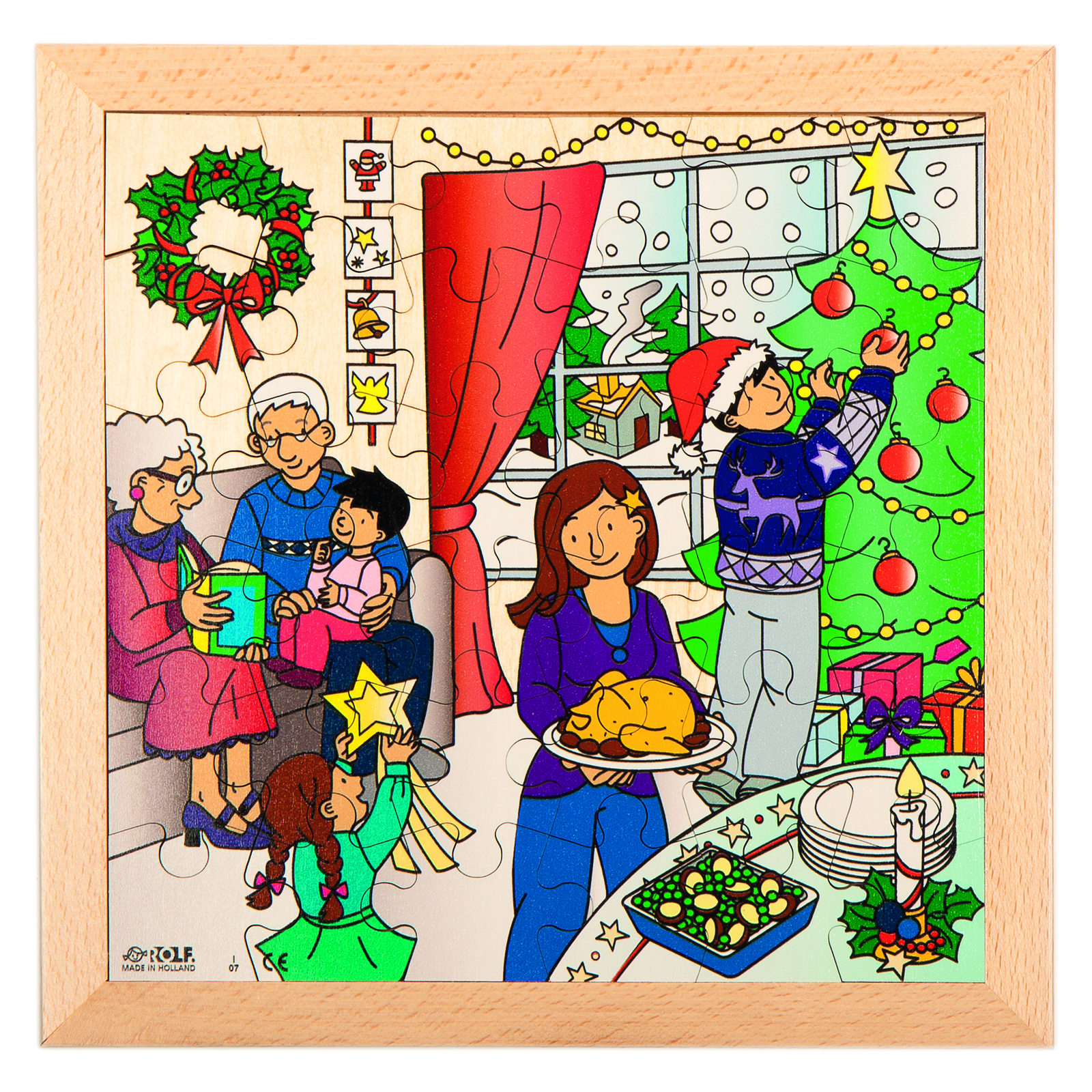 Puzzle éducatif sur les différentes fêtes et traditions. Contenu : 36 pièces et un cadre bois - Dim. (L x l) : 28 x 28 cm