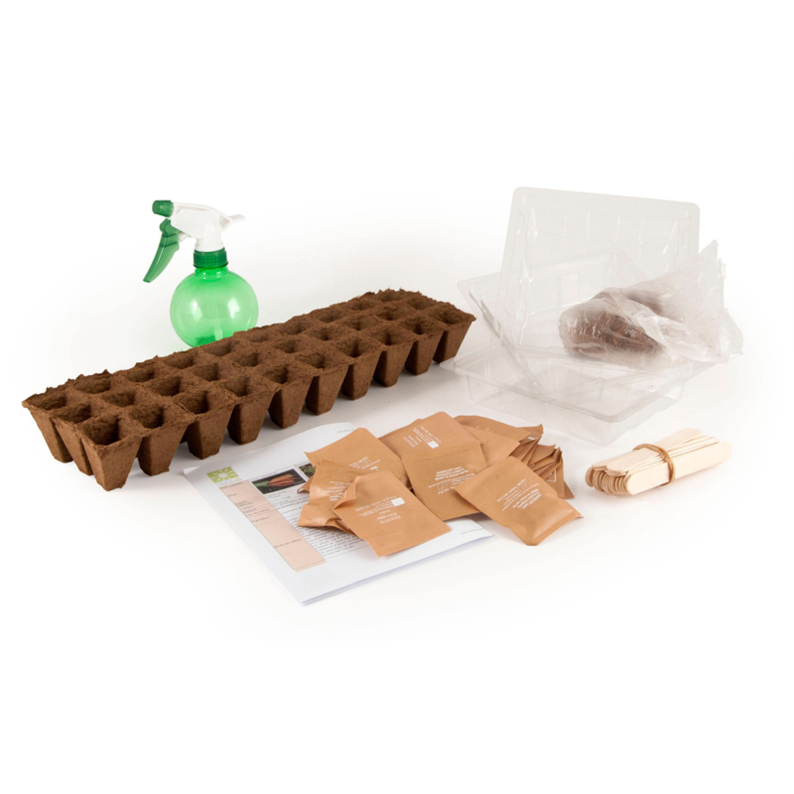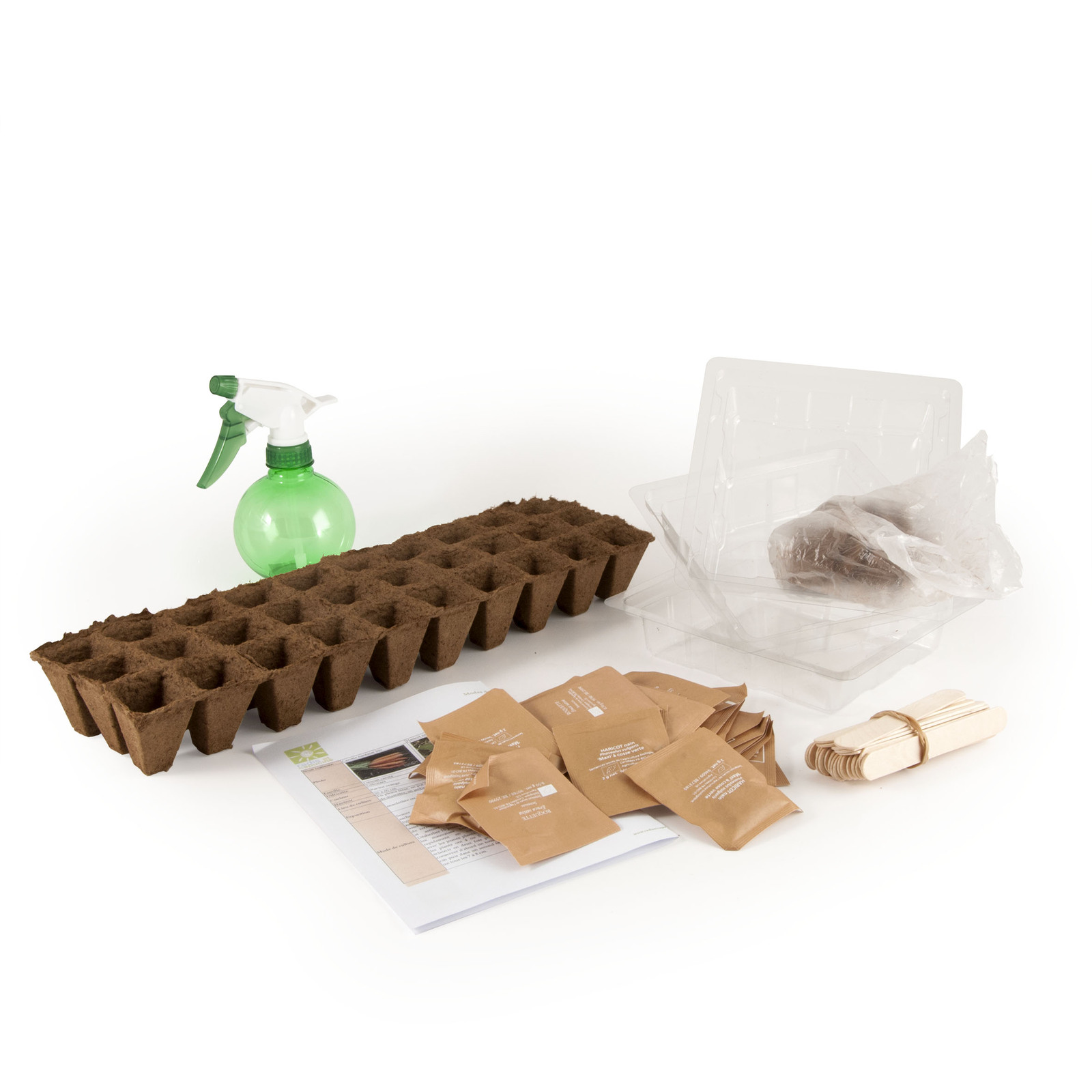 Contient 30 sachets de graines Bio assorties, 5 plaquettes de terre déshydratée (ØxH : 0.60 x 1 cm), 30 pots en tourbe biodégradables, 30 étiquettes en bois, 3 bacs pour semis, 1 vaporisateur 320 ml et 1 feuillet A4 de conseils de culture.Le lot de 30 sachets de graines Bio (tournesol nain «sunspot», calendula, bleuet, capucine naine «tom pouce», capucine grimpante, pâquerette blanche)
