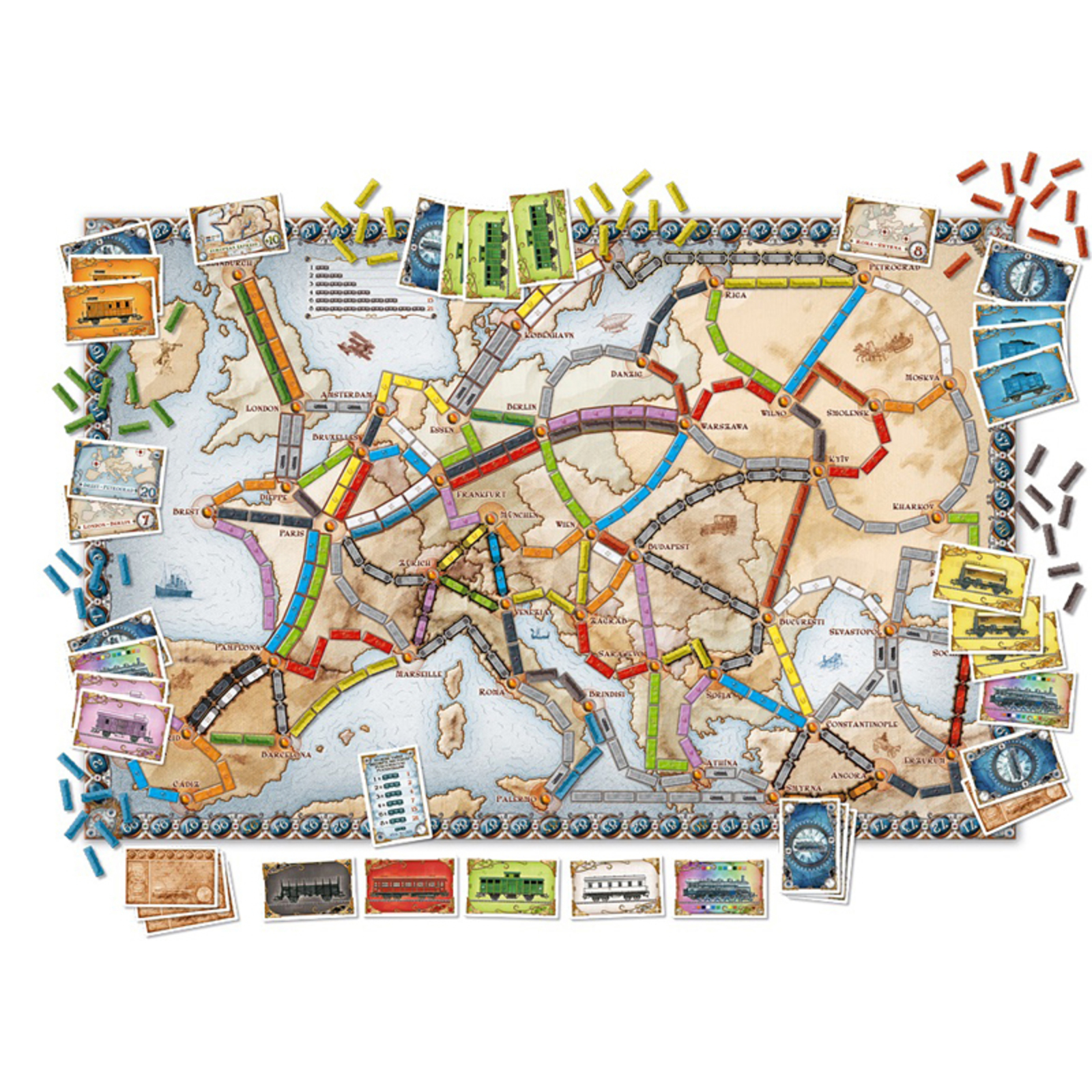But du jeu : reliez les villes emblématiques entre elles. D’Edimbourg à Constantinople, de Pampelune à la grande gare de Saint-petersbourg, les Aventuriers du rail Europe vous emmènent à la découverte de l’Europe des années 1900. Intérêt pédagogique : stratégie.Contenu : 1 plateau de jeu, 240 wagons de couleur, 15 gares de couleur, 110 cartes wagon, 46 cartes destination, 5 marqueurs de score en bois, 1 livret de règles et 1 numéro Days of Wonder pour jouer en ligne 2 à 5 joueurs - Durée : 40 min