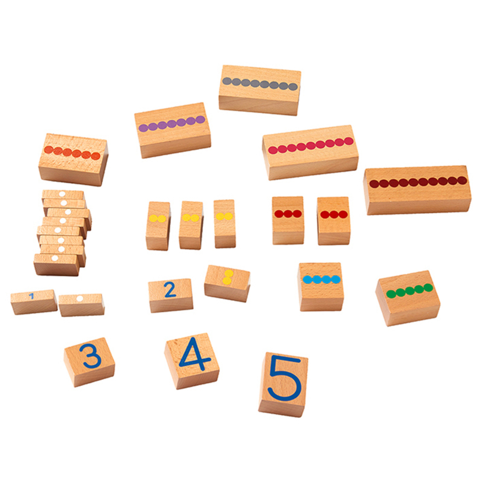 Support collectif pour découvrir autrement les nombres et apprendre à compter de façon ludique. Contenu : 27 blocs en bois illustrés sur 2 faces (collection de perles et écriture chiffrée) et 1 livret pédagogique