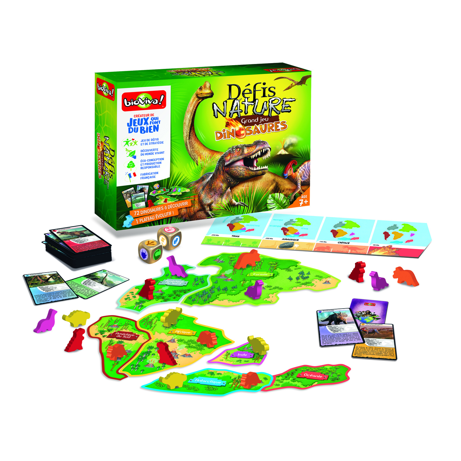 Implanter ses dinosaures sur la planète pour être majoritaire sur le maximum de continents avant la grande extinction des dinosaures. 1 frise, 7 plaques "Continent", 1 caillou, 50 dinosaures, 2 dés, 72 cartes, 1 livret