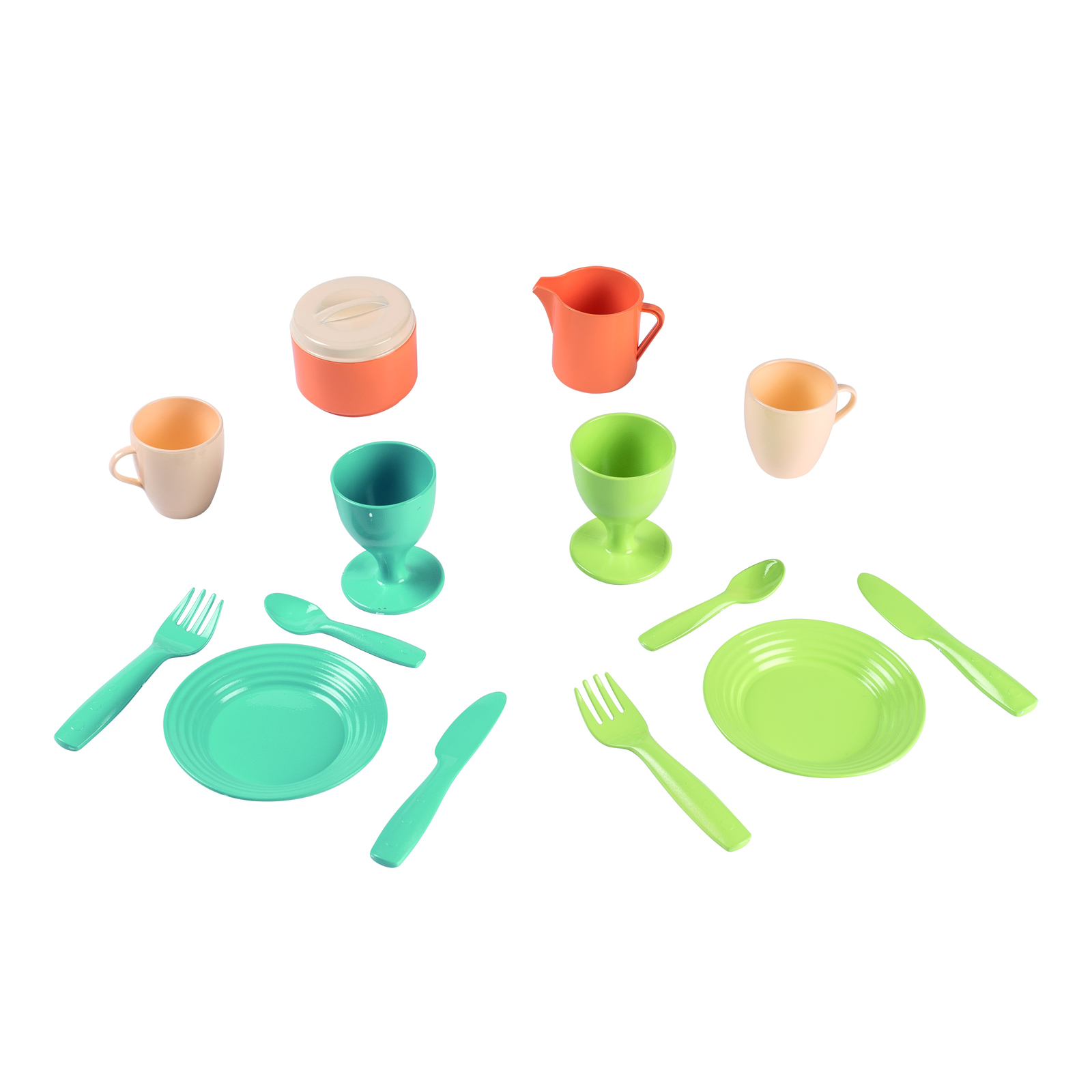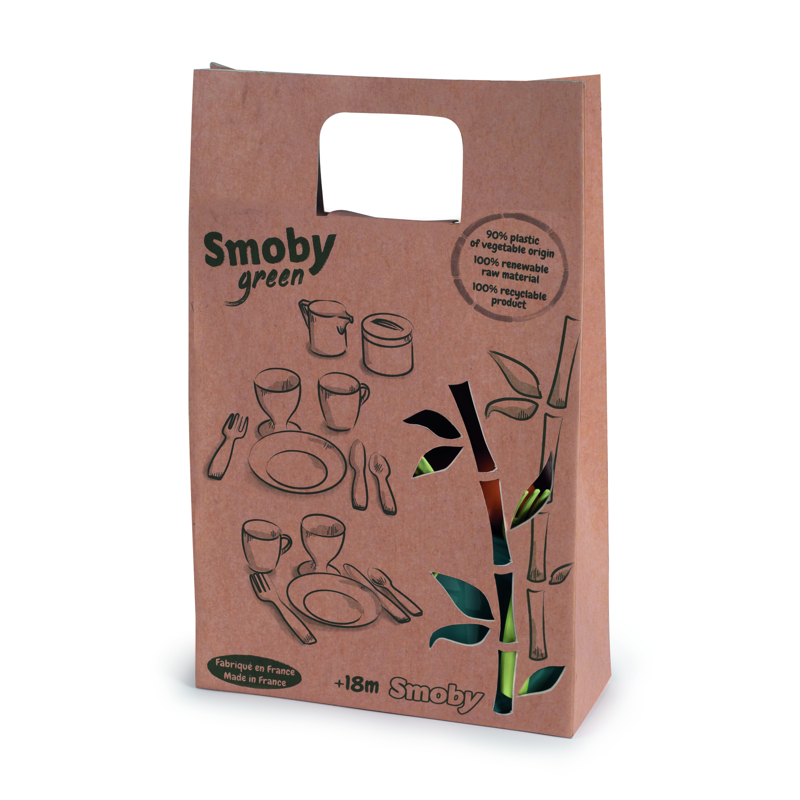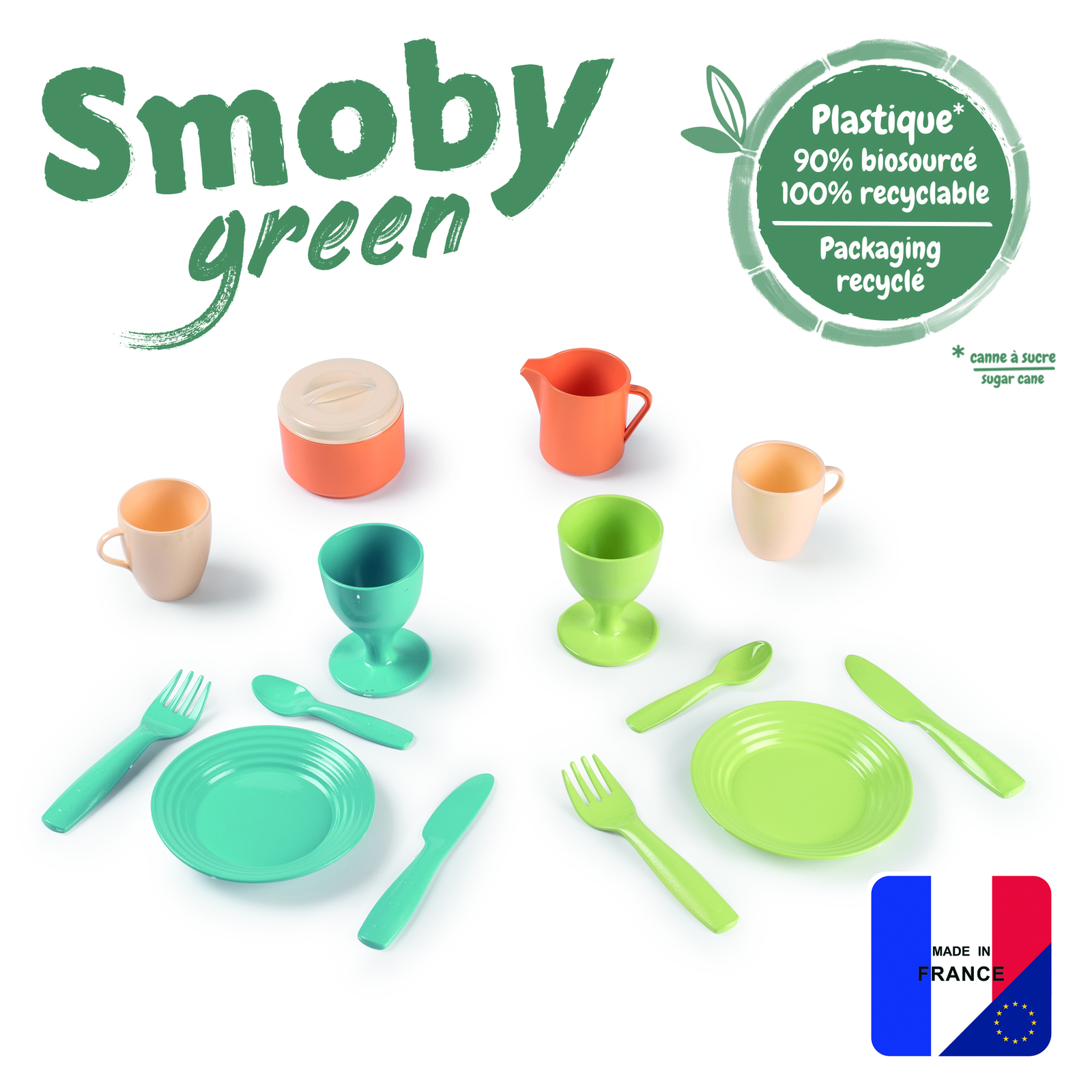 Plastique biosourcé. Produits 100% recyclables. Contenu : 2 tasses, 2 verres à pied, 2 assiettes, 2 fourchettes, 2 couteaux, 2 cuillères, 1 pot à lait, et 1 sucrier