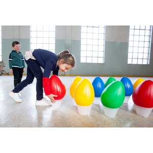 Objectifs pédagogiques : jouer en équipe et respecter les règles, améliorer le sens de l'observation, la reconnaissance des couleurs, etc...Avec un guide à télécharger gratuitement pour l'enseignant, où sont illustrées diverses activités motrices à pratiquer en extérieur ou en salle de sport. Contenu : 12 œufs (H : 30 cm), 12 œufs (H: 17 cm) et 24 supports en plastique