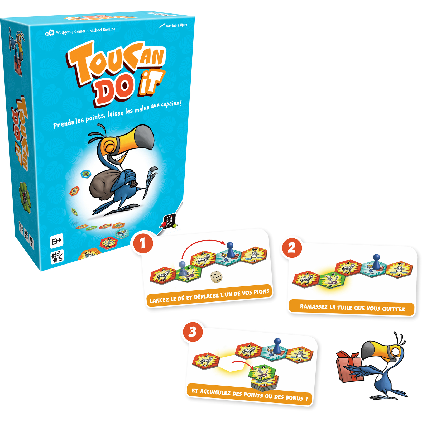 But du jeu : A chaque tour, le joueur lance le dé et déplace un de ses 3 pions du nombre de cases correspondant. S’il est seul lorsqu’il quitte une tuile points ou chance, il remporte la tuile et la place sur le dessus de sa pile. S’il quitte une tuile Action, il effectue l’action voler ou offrir selon la face visible, puis retourne simplement la tuile. Contenu : 1 tuile départ, 1 tuile arrivée, 4 tuiles Action recto cadeau, verso voleur, 8 tuiles points positifs, 18 tuiles points négatifs, 6 tuiles chance, 1 dé, 18 pions de 6 couleurs, 8 pions gardes
