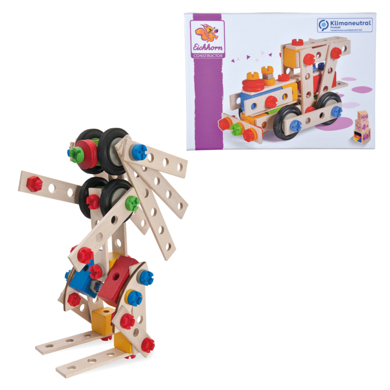 4 constructions possibles : une locomotive, un avion, une dépanneuse, ou un robot à l'aide du feuillet de modèles inclus.Contenu : 100 pièces comprenant des lamelles de bois de hetre perforées, des vis en plastique, des roues en caoutchouc et un tournevis