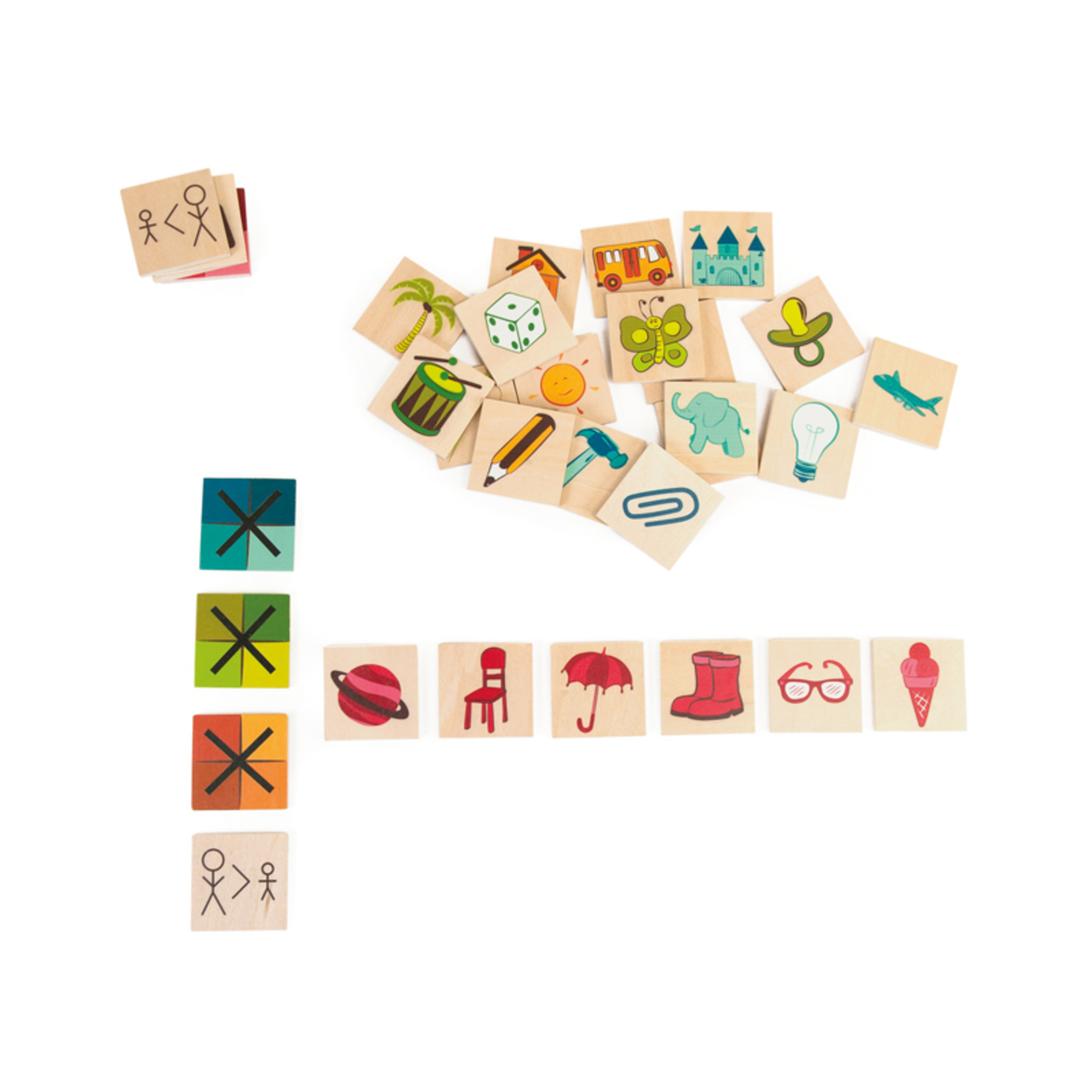 Jeu pour développer l'association d'images, le raisonnement logique et l'observation. Apprenez-en davantage sur les tailles et la distinction des couleurs. Comprend les attributs de poids, de gamme de couleurs et de taille. Associez les éléments sur les tableaux, vous pouvez jouer individuellement ou en groupe.Contenu : 24 pièces, 4 plaques modèles et 8 attributs
