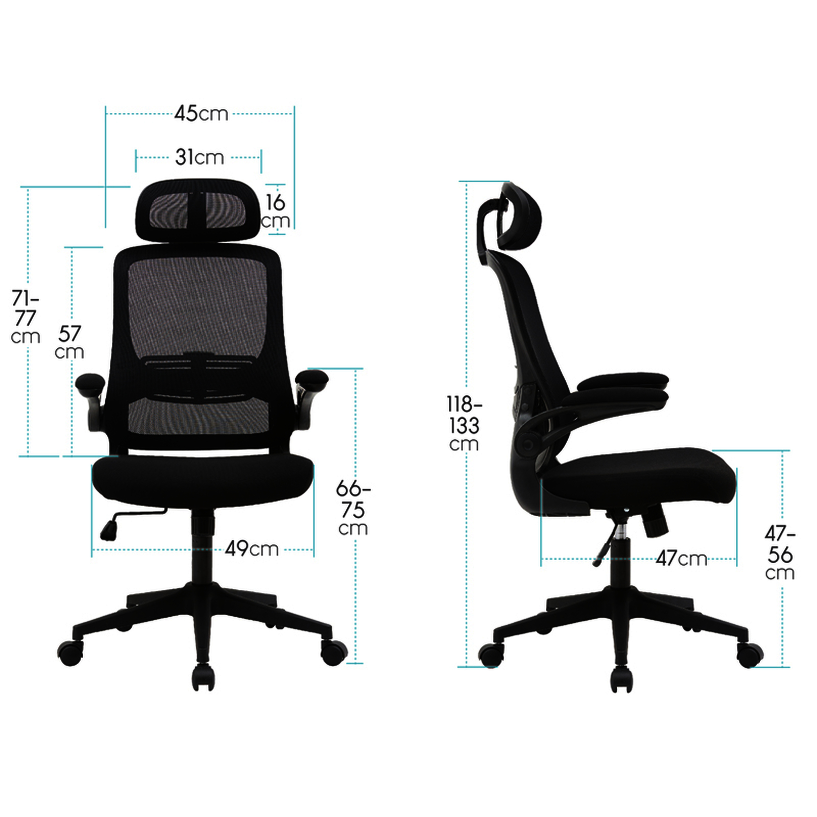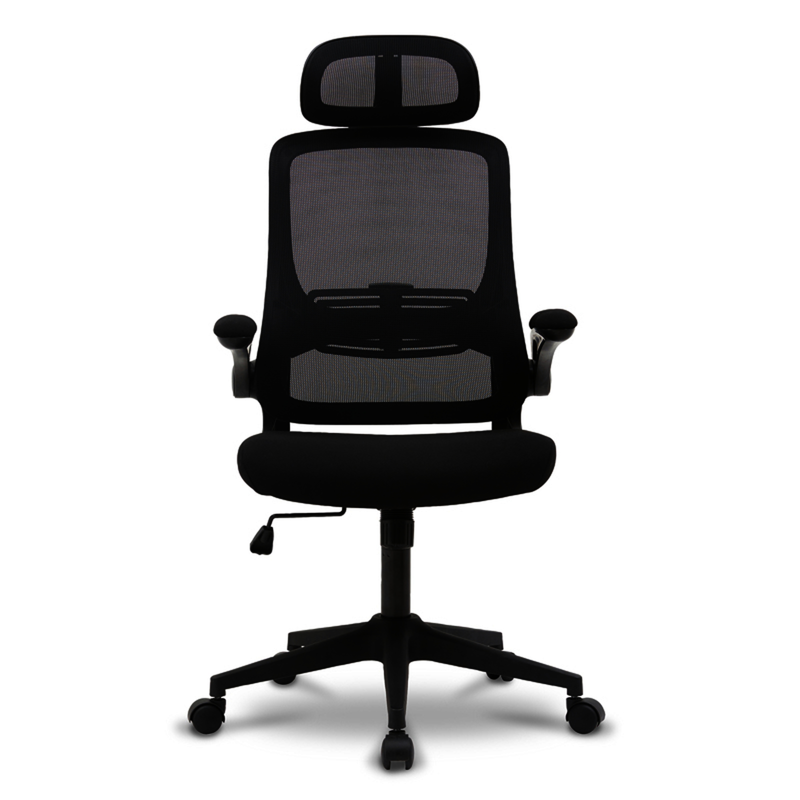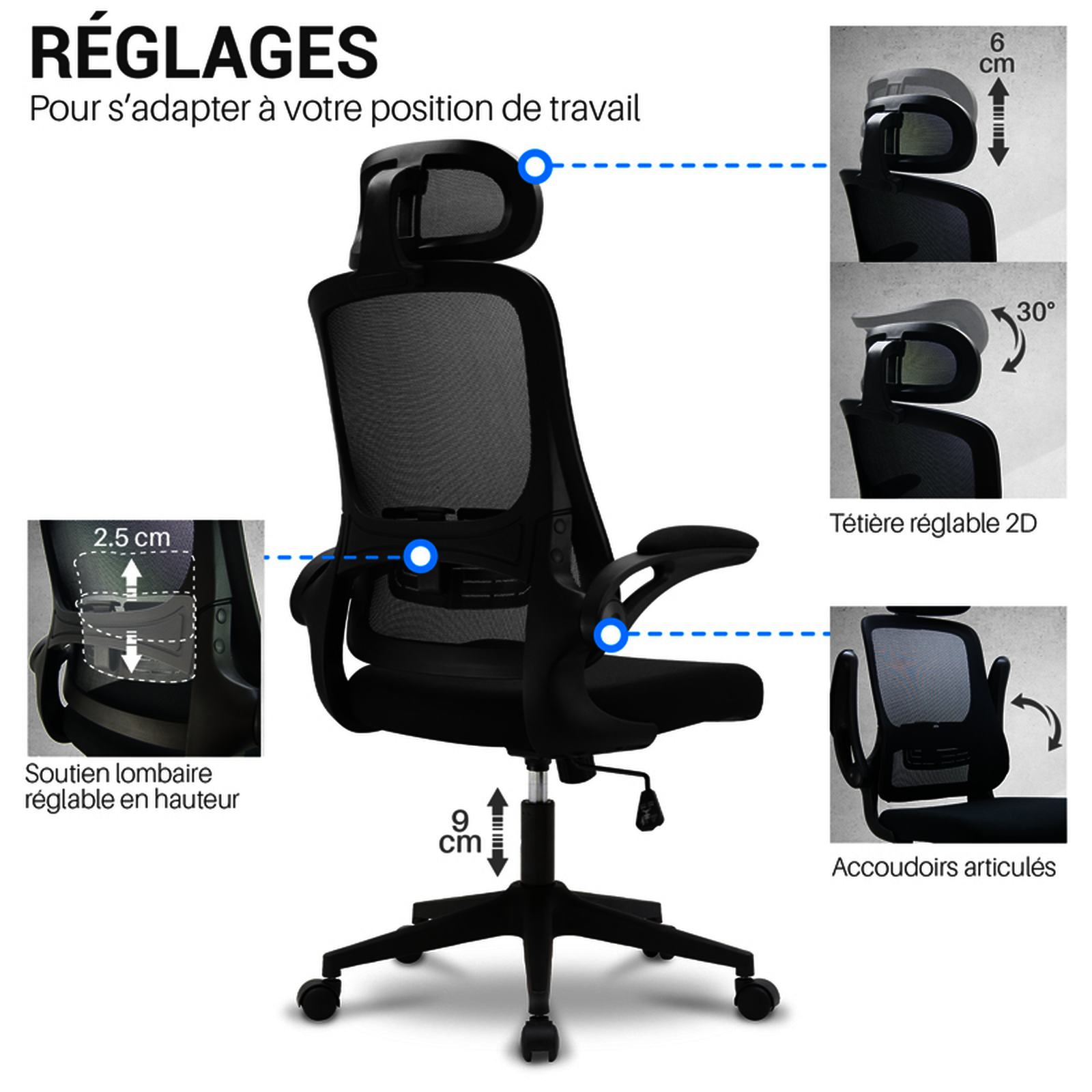 Fauteuil rotatif à 360°. Recouvert en maille et en tissu de couleur noire. Réglage en hauteur de l'assise. Appui-tête et dossier ajustables indépendemment. Accoudoirs ajustables en polypropylène. Base solide et résistante en acier chromé. 5 roues en nylon de 6 cm de diamètre. Usage régulier : de 5 à 8 heures par jour. Poids maximum : 200 kg. Dimensions : 1180 + 100 x 630 x 625 mm. Poids fauteuil : 12,4 kg.