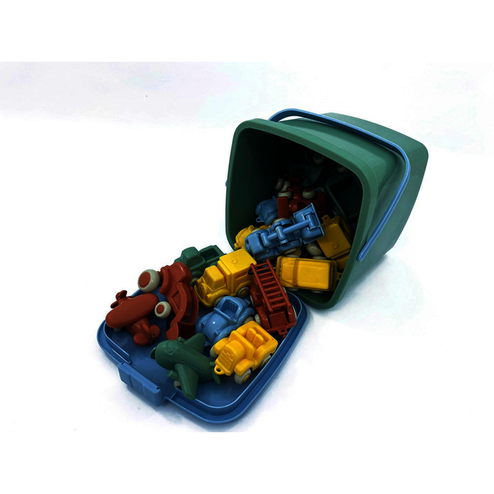 Diff?rents v?hicules color?s tels que des voitures, des camions, des bateaux et des avions. En plastique 100 % recycl?, passe au lave-vaisselle. Solide, sans ar?te vive, roues silencieuses.
