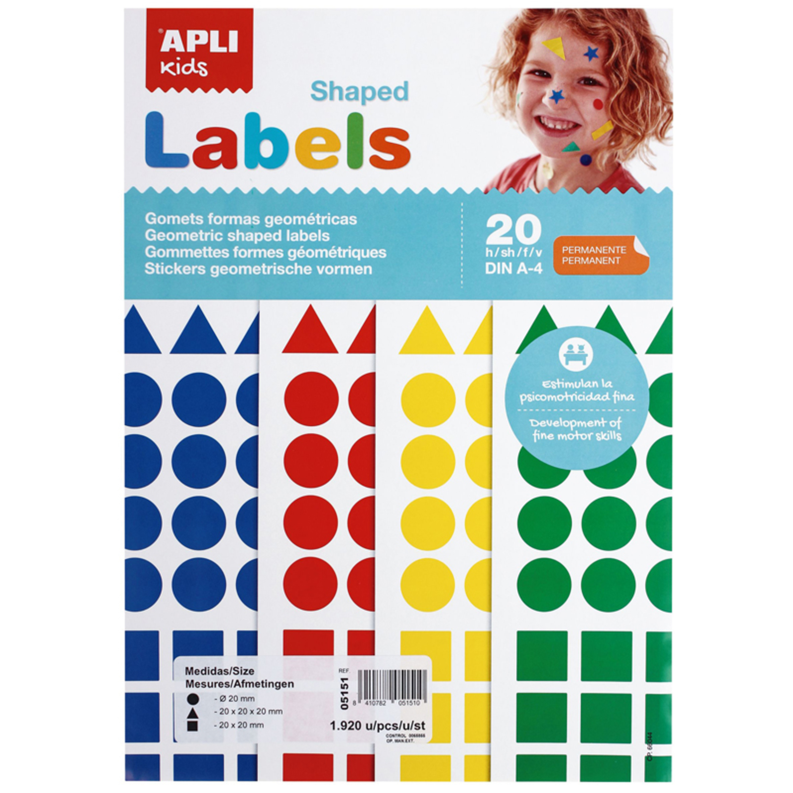 Dim. Triangle : 20 x 20 x 20 cm - Dim. Rond : Ø 20 mm - Dim. Carré : 20 x 20 cmPochette de 20 planches A4 - 1920 gommettes - 4 couleurs - Formes assortiesAdhésif permanent