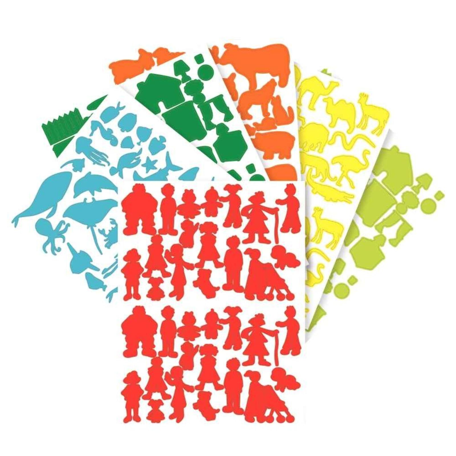 Assortiment multi-thématiques : les familles, les objets quotidiens, les transports, les animaux de la mer, les animaux de la savane et les animaux de la ferme. Pochette de 60 planches 16 x 21 cm - 2240 gommettes - 7 coloris assortis